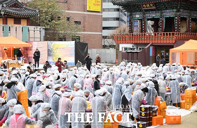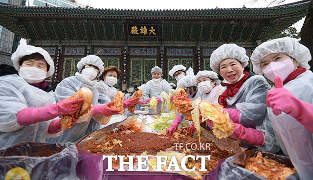 이날 서울 종로구 조계사 대웅전 앞마당에서는 승려와 신도 200여 명이 취약계층에 전달할 김장 봉사를 했다.