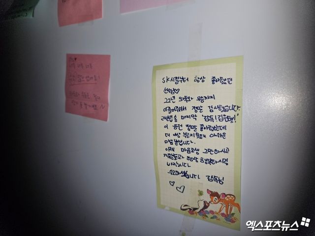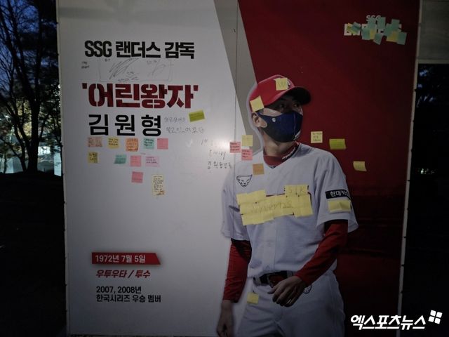 와이번스의 기억을 잊지 않고 싶었던 팬들은 이곳에도 많은 흔적을 남겼다. 포토존 곳곳에 메모지가 붙은 가운데, 세 시즌 만에 팀을 떠나게 된 김원형 전 감독의 포토존에는 '와이어 투 와이어 우승은 잊지 못할 거예요', '더 이상 감독님의 이름을 부르지 못해 아쉽습니다' 등 팬들이 전하는 메시지가 눈길을 끈다.