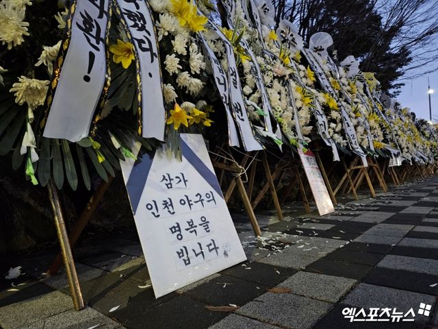 (엑스포츠뉴스 유준상 기자) 찬 바람이 불던 29일 오전 11시, SSG랜더스필드가 위치한 인천 문학경기장 북문 인근의 대로변에 수십 개의 근조화환이 도착했다.