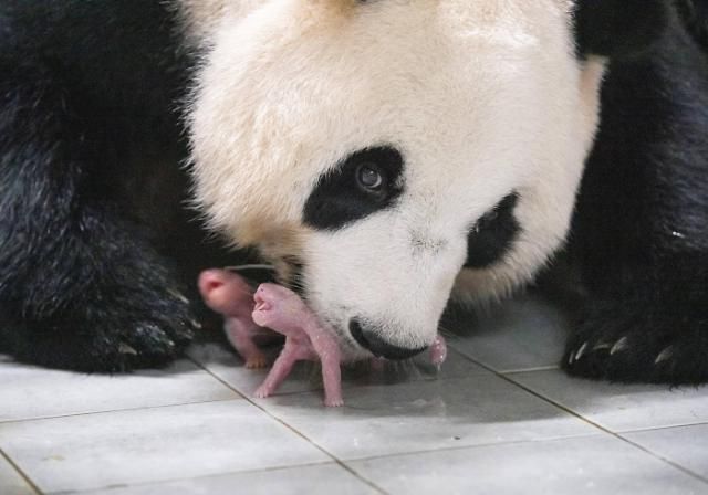 今年7月7日,大熊猫爱宝在爱宝乐园诞下双胞胎宝宝。【图片提供 韩联社】