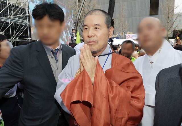 인도와 네팔에서 43일간 1,167km 길을 도보 성지 순례를 마친 상월결사 인도순례단 회주 자승 스님이 서울 종로구 조계사에서 열린 회향식에 참석하고 있다. / 뉴스1
