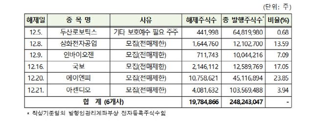 해제 주식 수 상위 3개 사는 디에스이엔(4000만주), JTC(950170) KDR(1508만주), 마녀공장(439090)(1천347만주) 등이다.