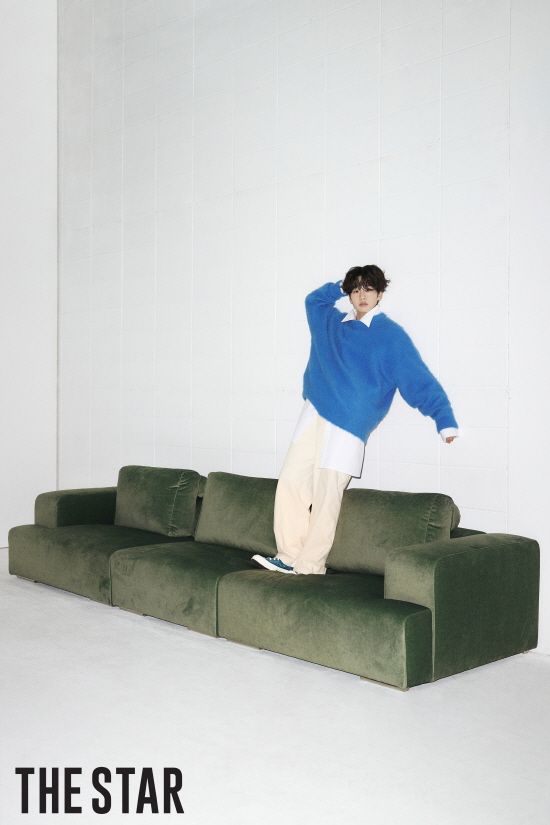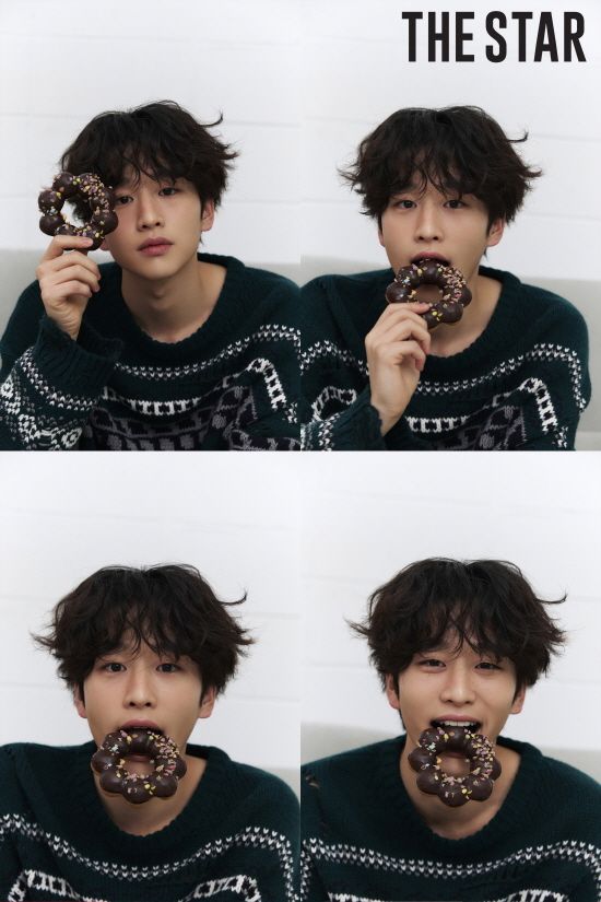 공개된 사진 속 김윤우는 큼직한 스웨터 셔츠를 입고 도넛을 입에 물거나 패브릭 소파에 편하게 기대 눕는 등 다채로운 매력을 자랑했다.