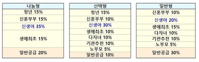 (맞벌이 기준 완화) 뉴:홈 특별공급에 맞벌이 가구는 1인 소득기준(일반공급, 월평균소득 100%)의 2배인 월평균소득 200%까지 청약가능한 추첨제(각 유형별 10%)를 신설한다.