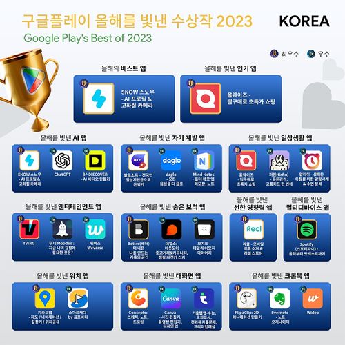 구글플레이 측은 "2023년은 AI 기술이 큰 화제가 된 해로, AI를 접목해 다양한 생활 속에서 활용할 수 있도록 돕는 앱들이 인기를 끌었다"면서 "고물가·고금리 시대를 반영해 경제적인 소비 활동을 돕는 앱들과 일상 속에서 남긴 기록들로 자신을 돌아보는 기록형 앱들도 사랑받았다"고 밝혔다.