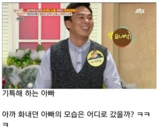 이를 본 누리꾼들은 "아빠!!! 표정관리!!" "애가 뭘 보고 저런 생각을 가지게 됐을까?" 등의 반응을 보였습니다.