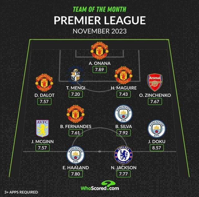 축구통계매체 '후스코어드닷컴'은 1일(한국시간) 2023-24시즌 프리미어리그(PL) 11월 평점 이달의 팀을 선정해 발표했다. 포메이션은 4-4-2다.