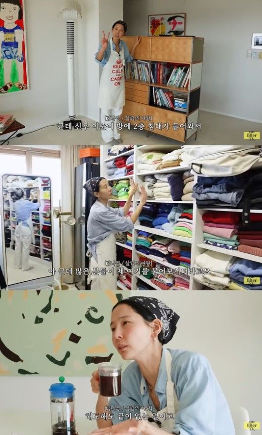 이어 그는 옷방을 소개하며 "옷이 많이 늘었다"면서 "선반장을 어디서 샀냐고 물어보시는데 치수를 재서 맞췄다. 서랍장은 열어야 하니까 귀찮지 않나. 한눈에 볼 수 있게 맞췄다"고 전했다.