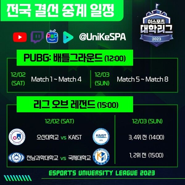 올해 전국 결선은 2일(토) 개회식을 시작으로 PUBG 종목 경기 4라운드와 LoL 종목 6강 및 4강이 진행된다. LoL 6강은 전국 본선 3위, 6위인 오산대학교와 카이스트가 맞붙고, 4위, 5위인 전남과학대학교와 국제대학교가 대결한다. 이후 LoL 4강의 두 경기가 동시 진행될 예정이다. 다음날 3일(일)에는 PUBG 종목 5라운드부터 8라운드까지 경기와 LoL 종목 결승전 및 3, 4위 전이 진행된다. 이후 폐회식을 끝으로 2023 이스포츠 대학리그의 막이 내리게 된다.