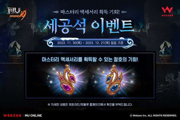 웹젠(대표 김태영)이 PC MMORPG ‘뮤 온라인’에서 ‘귀걸이’ 강화 소모 재료로 사용되는 '세공석' 관련 이벤트 2종을 선보인다.