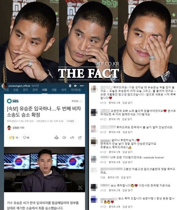 [더팩트ㅣ김샛별 기자] 가수 유승준이 한국 입국비자 발급 거부 처분 취소 소송에서 승소한 사실을 알리며 자축했다.