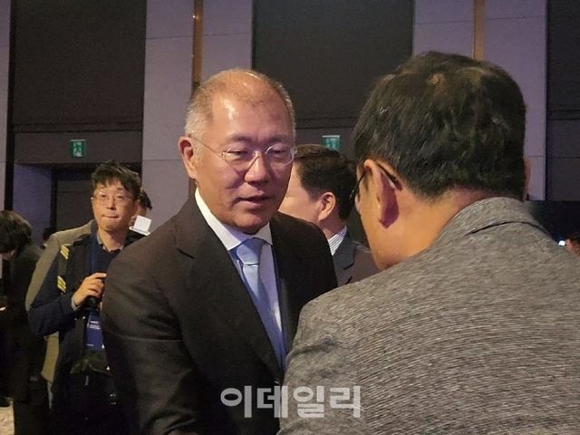 미리 행사장에 나타난 정 회장은 장영술 대한양궁협회 부회장과 함께 한국 양궁 60년사를 기념하는 전시를 둘러봤다. 정몽구 명예회장이 직접 선수들에게 선물한 사탕 통을 유심히 들여다보기도 했다. 이어 행사장에 입장한 정 회장은 양궁계 원로들과 일일이 인사를 나눴다.