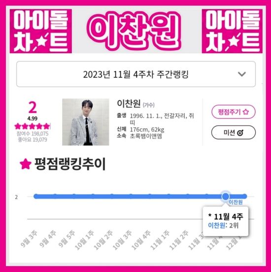 (엑스포츠뉴스 이정범 기자) 이찬원이 11월 4주 차 아이돌차트 평점 랭킹 2위에 올랐다.