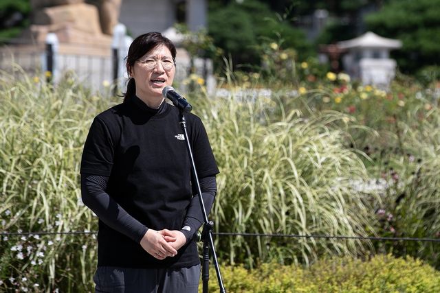 장미란 문화체육관광부 제2차관이 지난 9월 5일 서울 종로구 청와대 분수대 앞에서 열린 청와대 권역 K-클라이밍 행사에서 인사말하고 있다. / 뉴스1