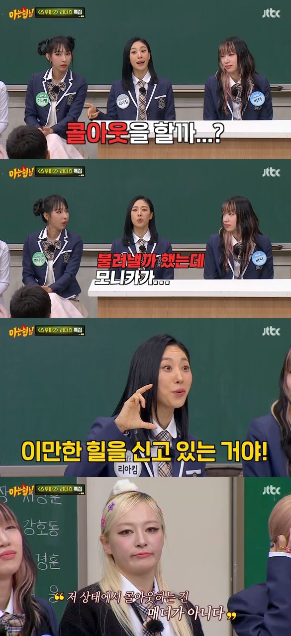 2일 방송된 JTBC '아는형님'에서는 '스우파2' 리더즈 특집이 진행됐다. 해당 방송에는 울플러 리더 할로, 원밀리언 리더 리아킴, 딥앤댑 리더 미나명, 마네퀸 리더 펑키와이, 레이디바운스 리더 놉, 베베 리더 바다가 출연했다.