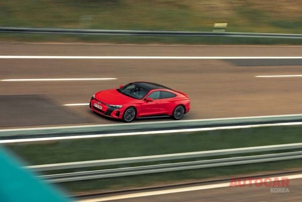 가득 충전한 E-트론은 B500 고속도로를 마음껏 경험할 수 있다. 주행모드는 다이내믹 모드. 이렇게 하면 스로틀이 짧아지고 차체 제어가 강화되며, 스티어링 무게가 증가할 뿐 아니라 2단 감속기어가 성능을 최적화한다. 빨간색 그래픽과 인공적인 사운드를 빼면 실내에 큰 변화는 없는데, 이것이 바로 이 차의 스타일이다. E-트론 GT에게 B500 도로는 마치 내 집처럼 편안하다. 이 같은 유형의 도로는 긴 거리에 걸쳐 큰 반경의 숨겨진 코너가 반복적으로 등장하며 힘겹게 만든다. 또한 노면도 고르지 않아 서스펜션의 내부를 모래로 채우더라도 그 차이를 거의 알아채지 못할 정도다.