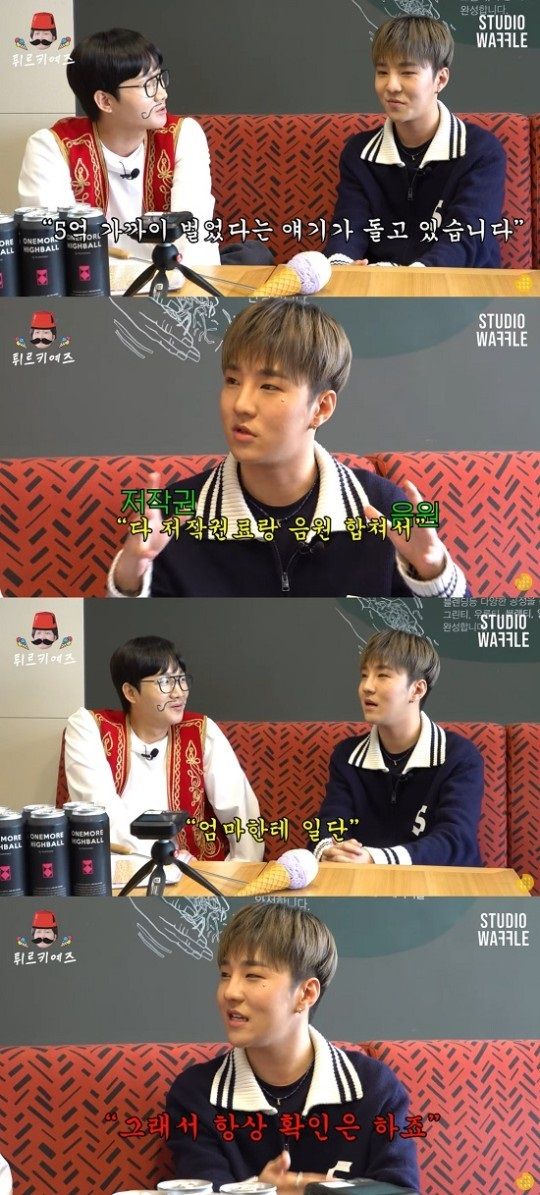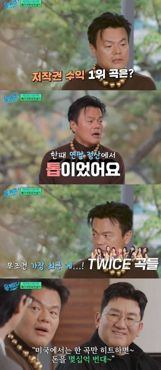 저작권 1위 곡을 묻자 "조건 최근 것"이라며 트와이스의 'What is Love ', 'Feel Special'을 언급했다. 이어 "단위가 다르다. 예전에 시혁이랑 그런 얘기를 했다. '미국에서는 한 곡만 히트하면 돈을 몇십억 번대' 근데 진짜 그렇게 됐다"고 이야기했다.