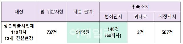 한편 고용부와 국토교통부는 합동으로 점검한 12개 건설현장 중 6개 현장에서도 불법 하도급과 임금 직접지급 위반을 적발했고, 사법처리 등의 조치를 취했다. 고용부는 확인된 체불에 대해서는 사법처리와 함께 청산 계획을 제출받아 향후 이행 상황을 점검하는 등 근로자 권리구제에 나설 방침이다.