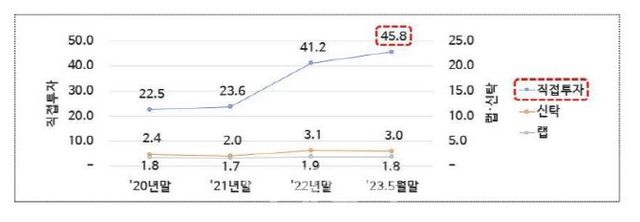 지난 5월 말 기준 개인투자자가 직접 투자한 채권의 평가잔액은 45조8000억원으로 2021년말(23조6000억원) 대비 약 2배 이상 증가했다. 올해 5월까지 채권 직접투자는 국내채권 장외거래가 83.5%로 가장 비중이 높은 것으로 나타났다. 주로 60대 이상의 투자자(51.5%)를 중심으로 오프라인(77.2%)에서 판매가 주로 이뤄졌다. 장기물 거래 비중도 2021년 3.4%에서 지난해 6.7%로 늘었고, 올해 5월까지 18.1%로 뛰었다.