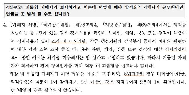 ‘가해자의 공무원 연금을 못 받게 할 수도 있나’라는 물음에는 “직장 내 괴롭힘 가해자가 해당 행위를 이유로 ‘파면’되면 5년 미만인 경우 퇴직급여(연금·퇴직수당)의 4분의 1이 감액되고, 5년 이상인 경우 퇴직급여의 2분의 1이 감액된다”며 “단 ‘해임’의 경우 감액되지 않는다”고 말했다.