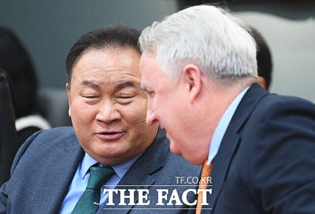 5선 중진인 이상민 의원이 3일 더불어민주당을 탈당했다. 사진은 이상민 더불어민주당 의원이 지난달 21일 한국과학기술원(KAIST)에서 열린 한국정치의 문제점과 개혁방안 토론회에 참석해 인요한 국민의힘 혁신위원장과 이야기를 나누는 모습. /이동률 기자