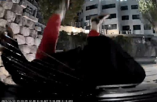 영상에는 검은색 외투를 입은 여성이 바로 옆 옹벽에서 균형을 잃고 차 위로 떨어지는 장면이 찍혀 있었다. 엉덩방아를 찧으며 차 앞 유리에 추락한 여성은 얼른 차에서 내려와 파손 부위를 살펴보는 듯하더니 자리를 떠났다.