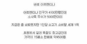 바로 아르헨티나입니다. 이곳은 인구에 비해 소가 더 많이 사육되고 있고 땅이 넓어 우사가 아닌 초원에서 방목으로 기른 최고급 소를 매우 싼 가격에 섭취할 수 있어 1인당 소고기 소비량도 세계 1위라고 합니다. 꼭 가서 먹어보고 싶네요.