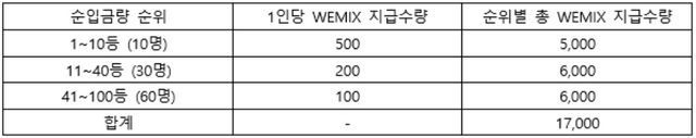 - 이벤트 내용: WEMIX 순입금량 순위에 따라 총 17,000 WEMIX 차등 지급