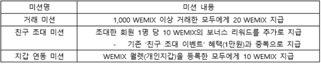 - 이벤트 내용: 달성에 성공한 미션의 WEMIX 리워드를 모두 합산하여 지급