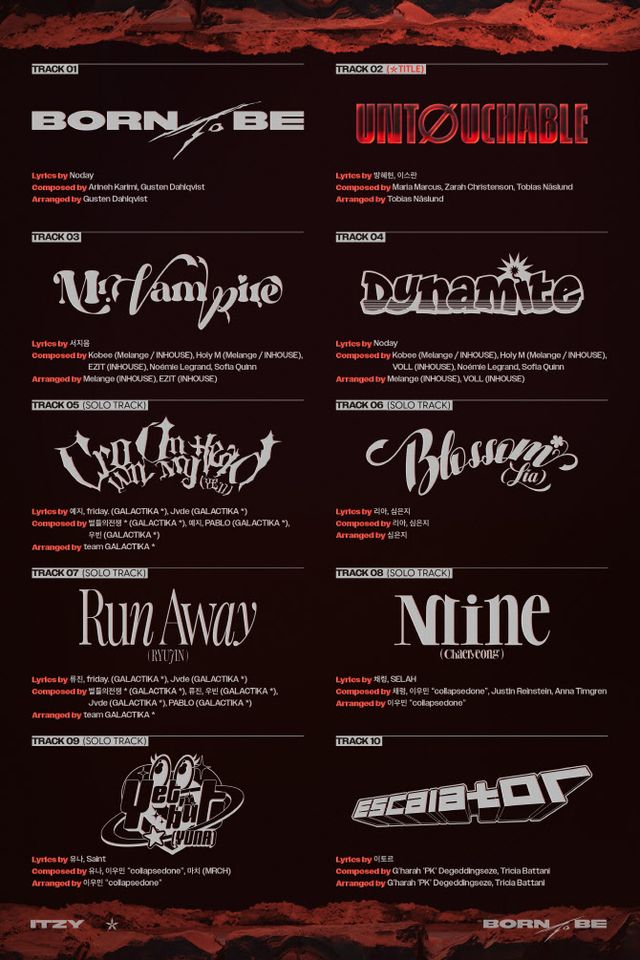 이번 앨범에는 타이틀곡 ‘언터처블’(UNTOUCHABLE)을 비롯해 ‘본 투 비’(BORN TO BE), ‘미스터 뱀파이어’(Mr. Vampire), ‘다이너마이트’(Dynamite), ‘크라운 온 마이 헤드’(Crown On My Head), ‘블러썸’(Blossom), ‘런 어웨이’(Run Away), ‘마인’(Mine), ‘옛, 벗’(Yet, but), ‘에스컬레이터’(Escalator) 등 10곡을 담았다.