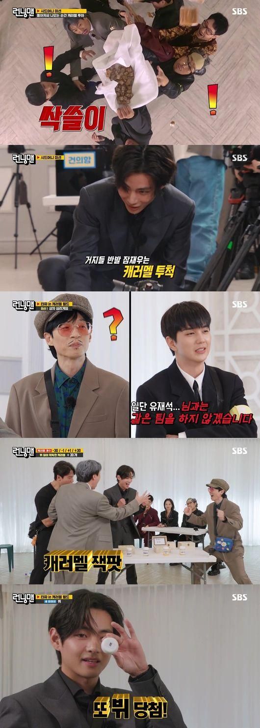 시작부터 뷔는 제작진 소품을 활용해 캐러멜을 싹쓸이해갔고, 반발하는 멤버들에게 캐러멜을 적선하는 유쾌한 모습을 보였다.
