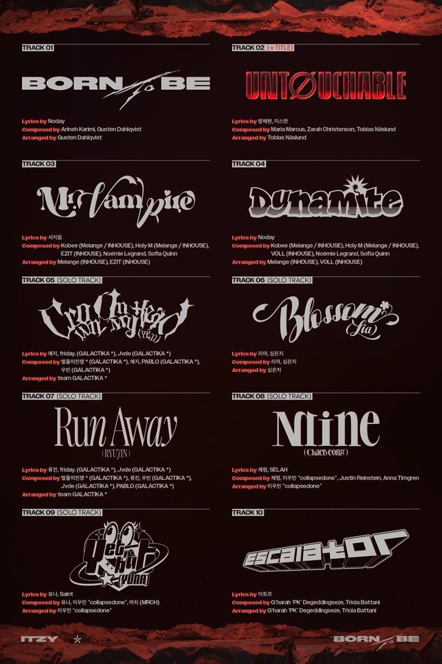 여기에 'BORN TO BE', 'Mr. Vampire', 'Dynamite'(다이너마이트), 'Crown On My Head (예지)'(크라운 온 마이 헤드 (예지)), 'Blossom (리아)'(블러썸 (리아)), 'Run Away (류진)'(런 어웨이 (류진)), 'Mine (채령)'(마인 (채령)), 'Yet, but (유나)'(옛, 벗 (유나)), 'Escalator'(에스컬레이터)까지 총 10곡이 빼곡히 수록됐고 멤버들은 자신의 첫 솔로곡 작사, 작곡에 직접 참여해 음악 역량을 뽐냈다.