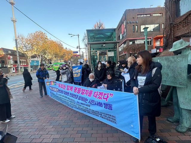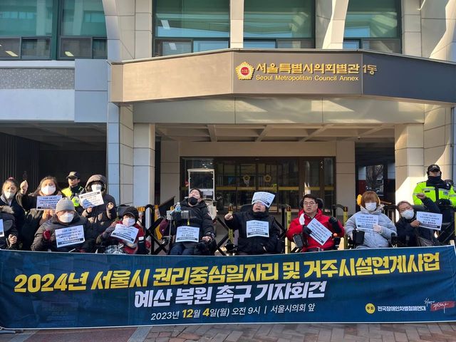 전장연은 혜화역 기자회견에 이어 이날 오전 9시 30분 서울시의회 앞에서 내년부터 폐지되는 서울시의 권리중심 중증장애인 맞춤형 공공일자리·거주시설 연계 장애인자립생활지원 사업 예산 복원을 촉구했다.