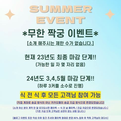 특히 ‘짝꿍 이벤트(최대 4명까지 가능)’ ‘사전 전액 결제 이벤트’ ‘SNS 계약 후기 리뷰 이벤트’ ‘숨고로 비대면 카드 결제 이벤트’ 등 할인 이벤트들이 많았다. 기존 금액 자체도 저렴했는데 8만원이나 더 할인받을 수 있었다. 할인 혜택을 받기 위해 계약 당일에 전액 완납하는 경우도 많았다.