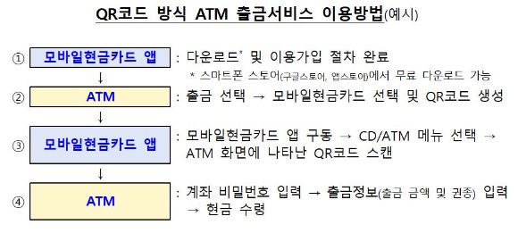 ATM에서 출금과 모바일 현금카드 메뉴를 순서대로 누르면 QR코드가 생성된다. 모바일 현금카드 앱을 켜 CD·ATM 메뉴를 누르고 QR코드를 스캔하면 된다. 계좌 비밀번호와 금액을 입력하면 현금을 받을 수 있다.