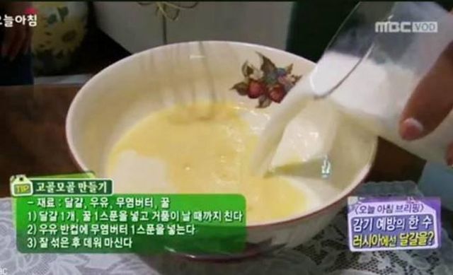 끓인 우유에 달걀과 꿀, 버터를 섞어 마신다.