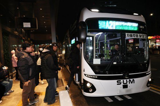 4일 오후 11시 반경 서울 마포구 합정역 정류장에서 시민들이 세계 첫 심야 자율주행버스 ‘심야 A21번’에 탑승하고 있다. 뉴스1