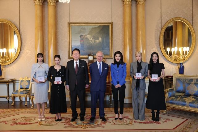 영국을 국빈 방문 중인 윤석열 대통령과 김건희 여사가 지난달 22일(현지 시각) 영국 런던 버킹엄궁에서 열린 문화예술인 격려행사에서 찰스 3세 국왕으로부터 대영제국훈장을 받은 그룹 블랙핑크와 함께 기념 촬영을 하고 있다. / 뉴스1=대통령실