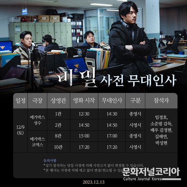 문화저널코리아 김영일 기자 | 12월 13일 개봉해 극장가에 강렬한 긴장감을 선사할 올해의 추적 스릴러 '비밀'이 개봉 전 주말 무대인사를 확정했다.