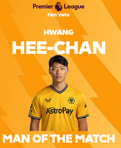 오닐 감독을 흡족하게 만든 황희찬은 이번 경기 공식 최우수 선수로 선정됐다. 경기 후 수훈 선수를 선정하는 MOTM(Man of the match) 투표에서 총 1만147표 중 83.5%라는 압도적인 득표율로 1위에 올랐다. 선방쇼를 펼친 울버햄프턴 골키퍼 대니얼 벤틀리는 2위를 차지했지만 득표율 6.4%로 크게 밀렸다.