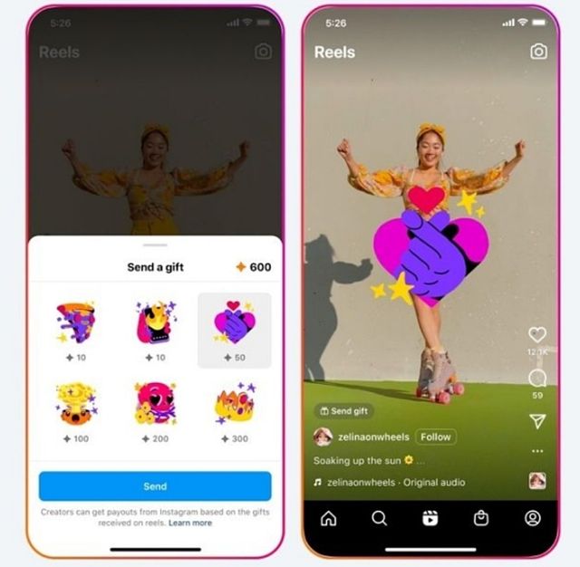 지난 5일 국내에서 시작한 인스타그램 기프트 시범 서비스. '릴스' 시청 도중 후원 아이템 '스타'를 크리에이터에게 보낼 수 있다. / 메타 제공
