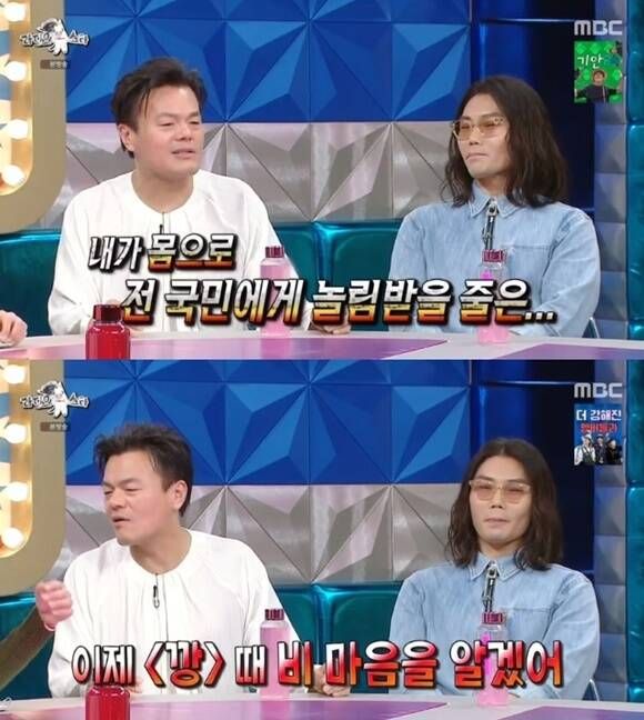 박진영은 "그 게시물 내리고 싶다. 그런데 갑자기 내리자니 모양 빠져서 내릴 수도 없다"며 "전 국민에게 놀림 받을 줄 몰랐다"고 말했다. 그러면서 "'깡' 때 비의 마음을 이제 알겠다"라고 덧붙였다.