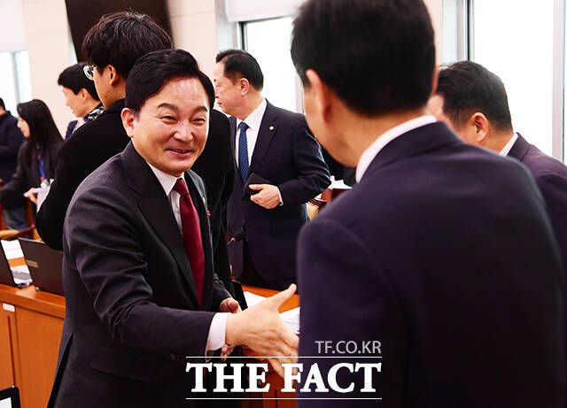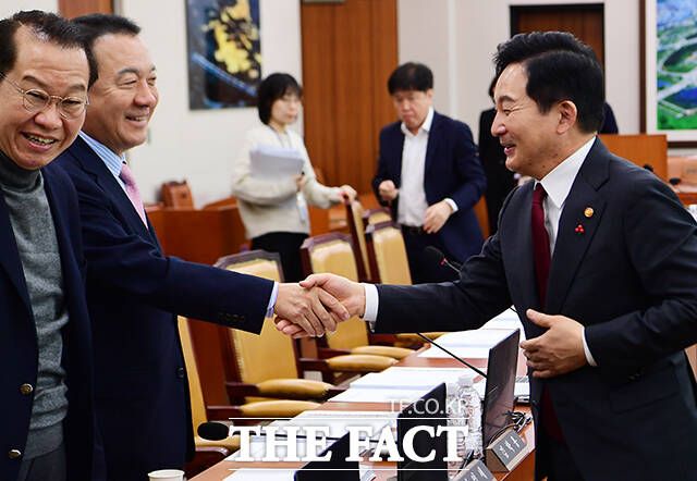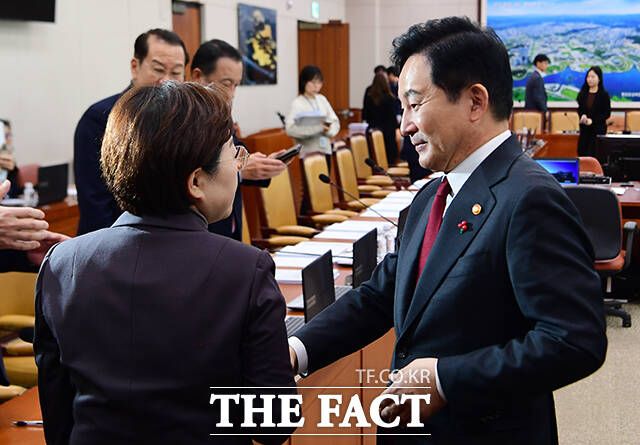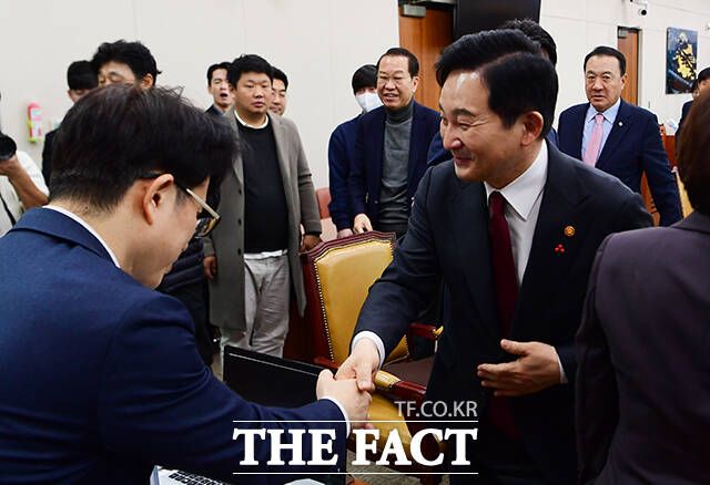 [더팩트ㅣ국회=배정한 기자] 원희룡 국토교통부 장관이 7일 오전 서울 여의도 국회에서 열린 국토교통위원회 전체회의에 참석해 여야 의원들과 인사를 하고 있다.