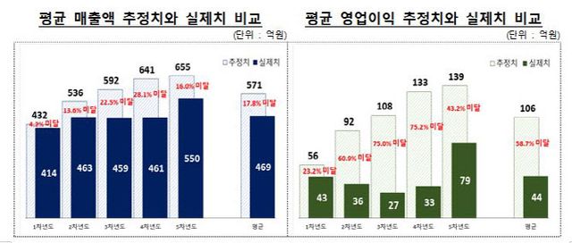특히 이들 기업의 평균 매출액 추정치는 571억원이었으나 실제로는 469억원이었다. 추정치에 비해 17.8% 미달한 것이다. 평균 영업이익 추정치는 106억원이나 실제는 44억원으로 58.7% 미달했다.