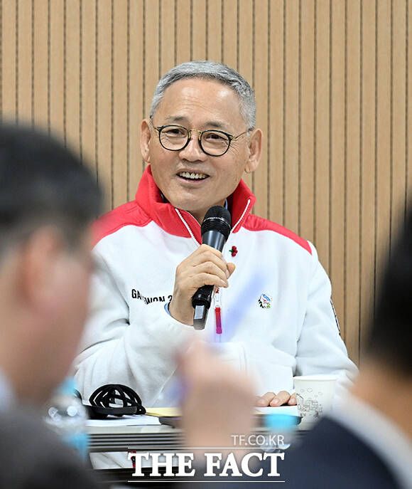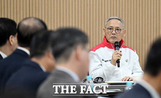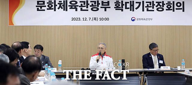 [더팩트ㅣ세종=이동률 기자] 유인촌 문화체육관광부 장관이 7일 오전 세종시 국립세종도서관에서 열린 확대기관장회의에 참석해 발언하고 있다.