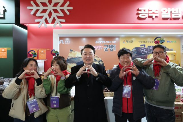 ▲윤석열 대통령이 7일 오후 서울 중구 동대문디자인플라자(DDP)에서 열린 2023년 눈꽃 동행축제 개막행사를 마친 뒤 공주알밤 부스를 찾아 관계자들과 기념촬영을 하고 있다. ⓒ연합뉴스