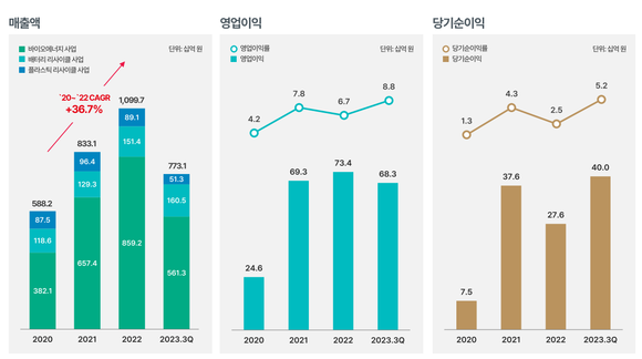 바이오 에너지 사업의 순항으로 최근 3개년간 연평균 성장률 36.7% 달성했으며, 지난해 기준 매출액은 1조990억원. 영업이익은 734억원을 기록했다.