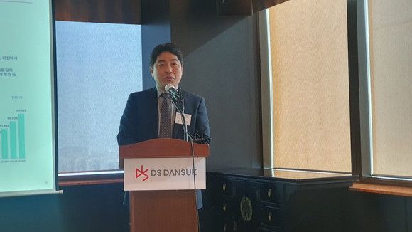 김종완 DS단석 대표이사가 IPO 기자간담회에서 프레젠테이션을 진행 중인 모습. = 박기훈 기자