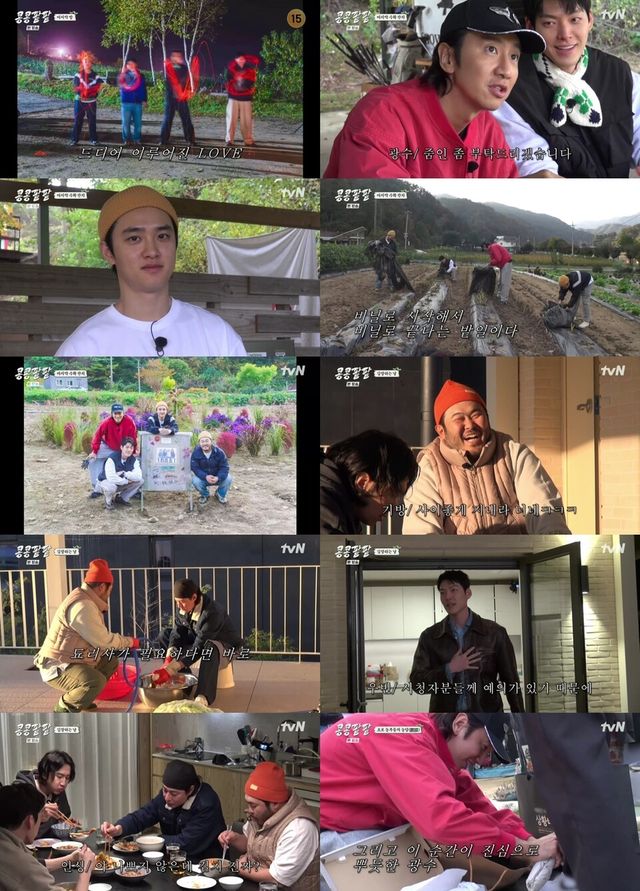 지난 8일 방송한 tvN '콩 심은 데 콩 나고 팥 심은 데 팥 난다'(이하 '콩콩팥팥') 마지막 회에서는 이광수, 김우빈, 도경수, 김기방이 농촌 생활을 도와주신 동네 어르신들과 아쉬운 작별 인사를 나눴다. 또한 깜짝 게스트 조인성과 김장 김치 담그기를 완수, 끝까지 유쾌한 에너지를 전했다.