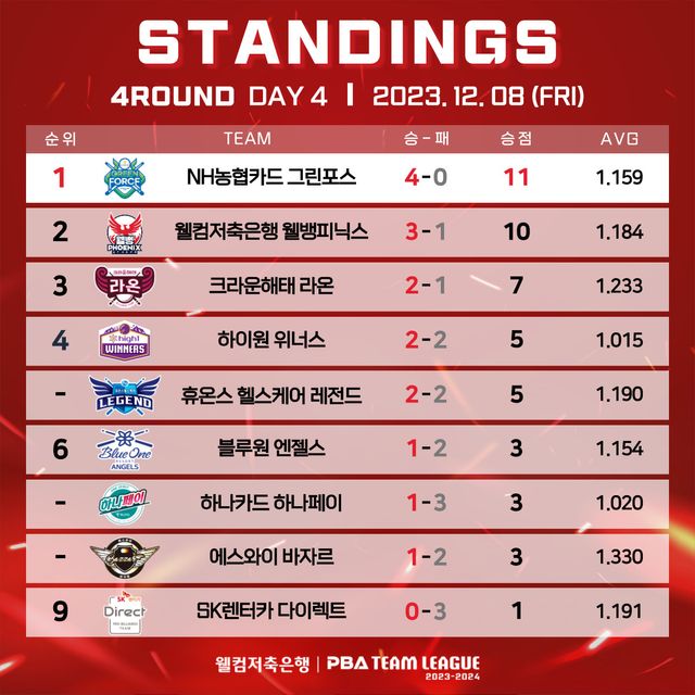 이밖에 NH농협카드는 김현우가 1세트에서 퍼펙트큐를 달성하는 등 블루원리조트를 세트스코어 4-2로 제압해 12연승을 질주하며 단독 선두(승점11)를 지켰고, 웰컴저축은행은 이상대가 2승을 챙기는 등 SK렌터카를 4-2로 꺾고 2위(승점10)에 올라 선두 NH농협카드를 바짝 추격했다.
